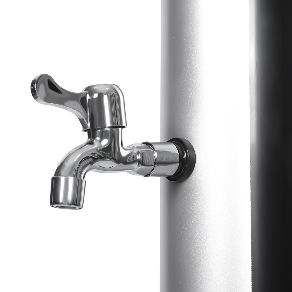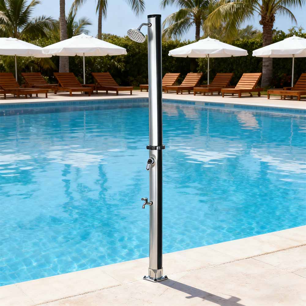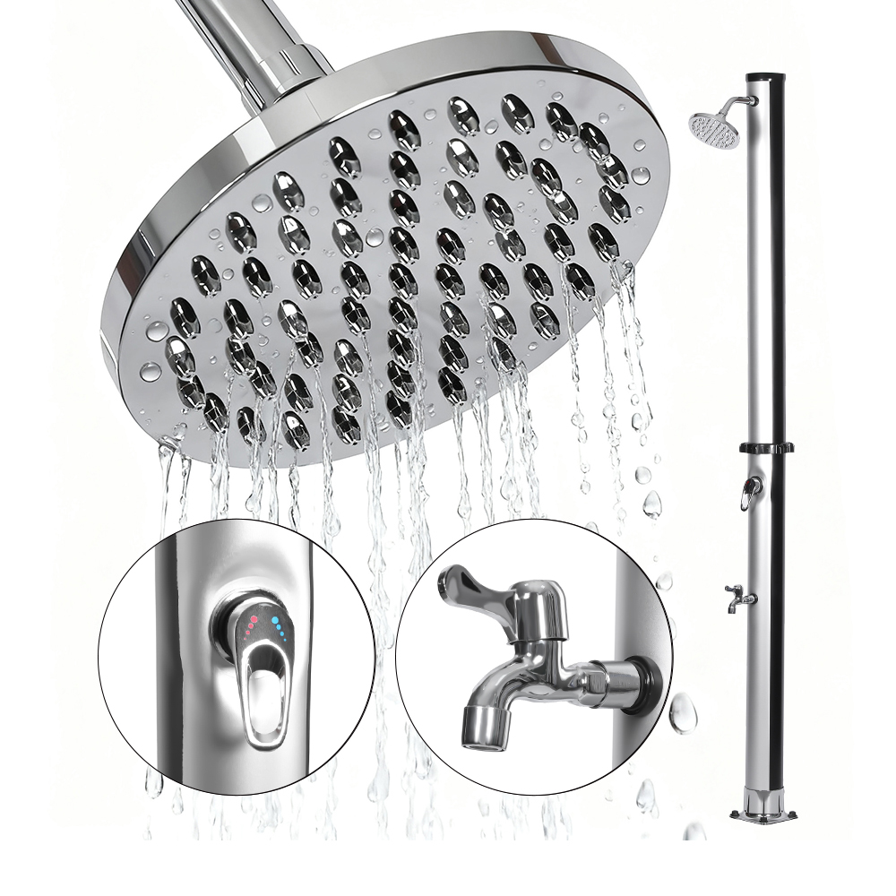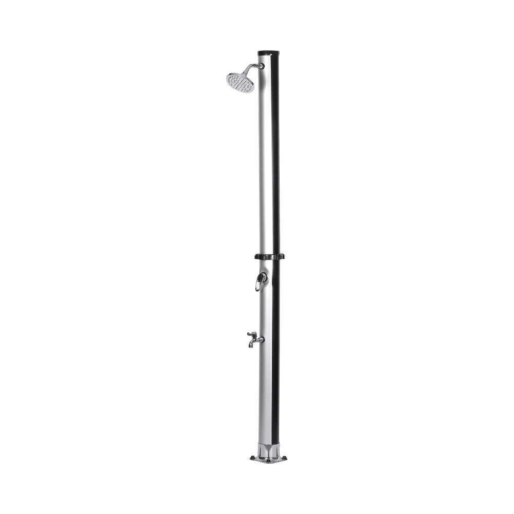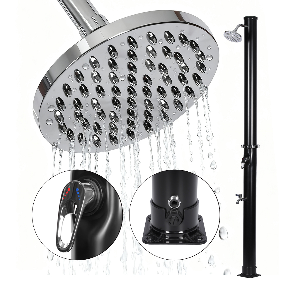 Progettata per il comfort all'aperto, questa colonna doccia solare in pvc da giardino da esterno con base LY18L01 da 18 litri è ideale per giardini, aree a bordo piscina e campeggio, rappresentando una delle ultime innovazioni nel riscaldamento dell'acqua senza apporto di energia esterna. Consente un facile controllo della temperatura dell'acqua attraverso un miscelatore monocomando che miscela l'acqua riscaldata del tubo della doccia con l'acqua fredda del tubo, garantendo un'esperienza confortevole. Costruito con una base in PVC resistente per stabilità e supporto affidabili, dispone anche di un grande soffione a pioggia con un angolo regolabile di 180° tramite il suo giunto sferico integrato, fornendo un effetto rinfrescante e rinfrescante. La configurazione è rapida e semplice, rendendolo una comoda aggiunta a varie impostazioni esterne.