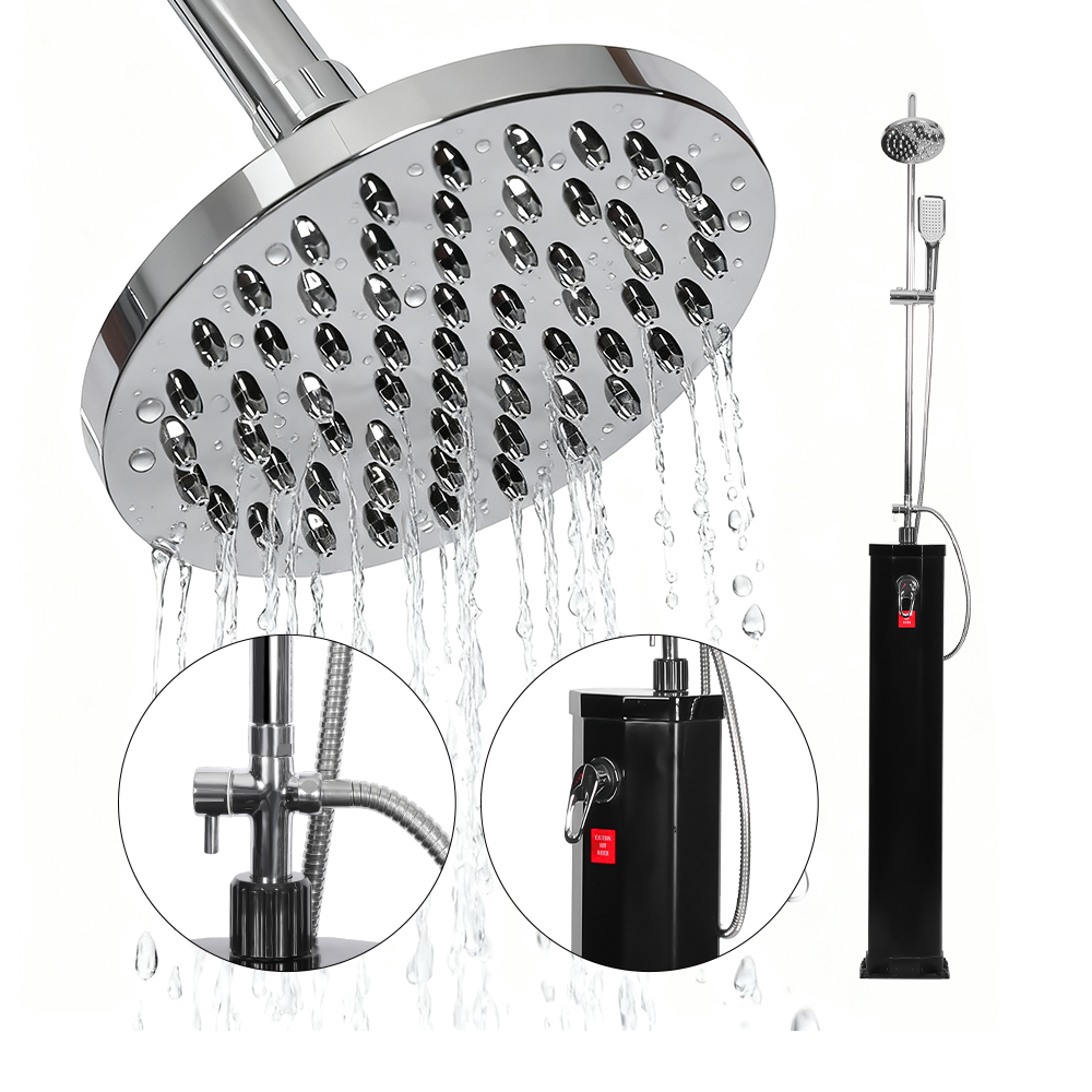 Questa doccia solare in pvc a bordo piscina da 18 litri con soffione mobile in acciaio inossidabile LY18L09-B è progettata per portare comfort e relax in una varietà di ambienti esterni, sia in giardino, a bordo piscina o in campeggio, offrendo una soluzione moderna per godersi l'acqua calda senza la necessità di fonti di energia esterne. It features an oversized rain shower head with a built-in ball joint that allows for easy adjustment up to 180°, ensuring flexibility in use and making setup simple. Il soffione doccia flessibile in stile foresta pluviale migliora l'esperienza consentendoti di controllare facilmente il flusso dell'acqua, creando una sensazione rilassante, simile a quella di una spa, simile a quella di stare sotto una cascata naturale. Insieme, queste caratteristiche offrono un'esperienza doccia rinfrescante e personalizzabile, rendendola ideale per chiunque cerchi praticità e relax all'aria aperta.