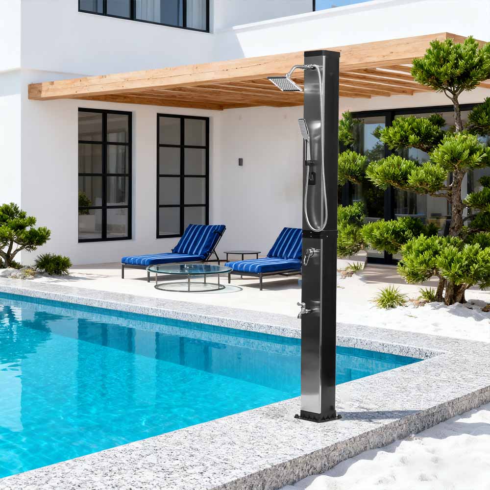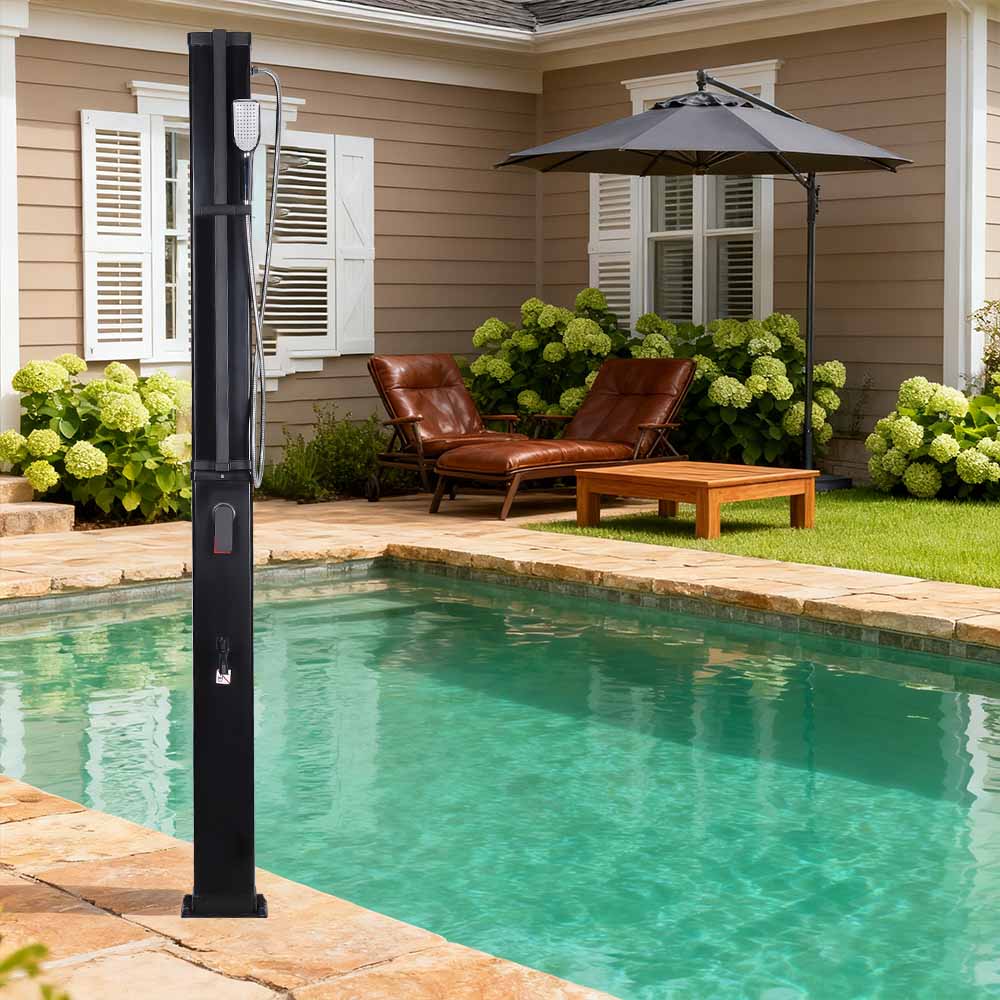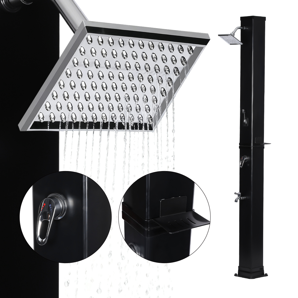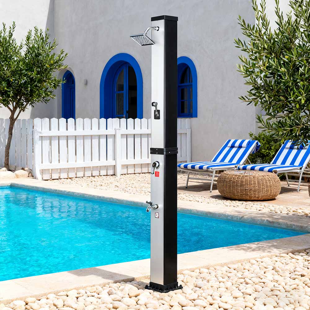 Questa doccia solare multifunzionale di grande capacità LY35L07 utilizza solo la luce solare per riscaldare l'acqua fino a 60°C, offrendo un modo a risparmio energetico ed ecologico per godersi il bagno all'aperto. Riempirlo è semplice: basta collegare un tubo da giardino standard all'ingresso e il tubo della doccia sarà rapidamente pronto per l'uso. Un ripiano in metallo integrato offre un posto comodo per riporre il gel doccia e altri oggetti essenziali, mentre i fori di drenaggio alla base assicurano che l'acqua defluisca in modo efficiente, mantenendo l'area asciutta e ordinata. Progettata pensando alla versatilità, questa doccia solare è perfetta per vari ambienti, sia in spiaggia, in piscina, in una casa vacanza, in hotel o in bungalow. La sua struttura flessibile gli permette di adattarsi a diversi ambienti.
